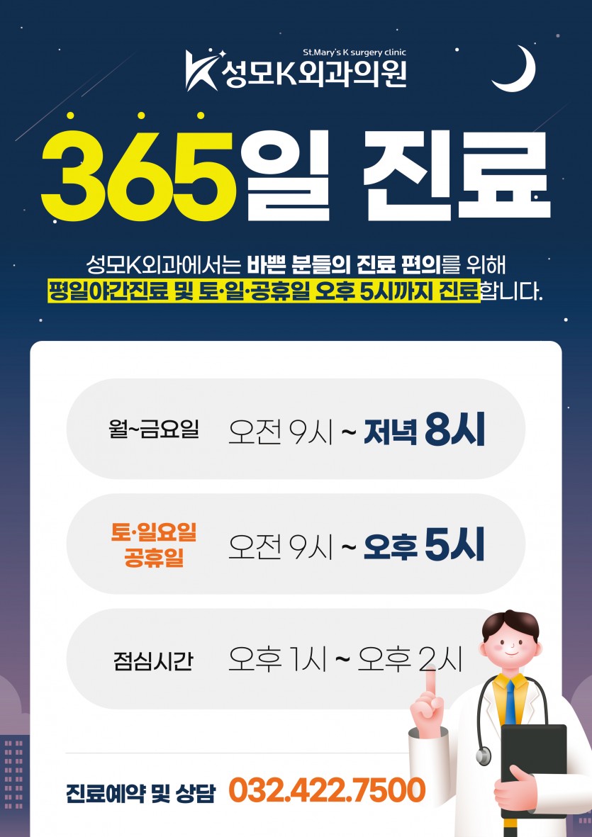 365일 진료! 평일야간진료 및 토/일/공휴일 오후 5시까지 진료합니다.